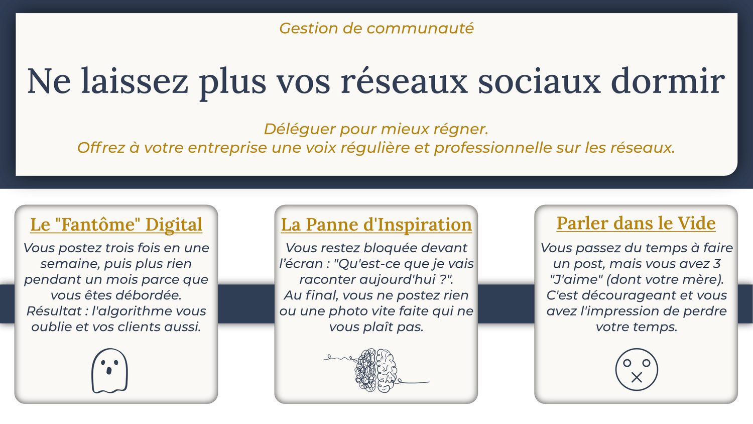 Le but n'est pas de poster pour poster, mais de créer un rendez-vous avec vos clients. Je construis votre ligne éditoriale, je rédige vos textes et je programme tout à l'avance. Votre seul travail ? Valider et regarder l'audience.