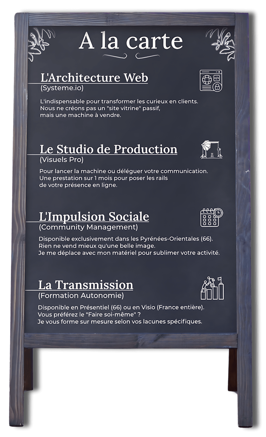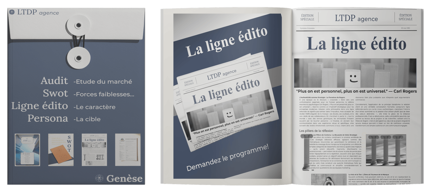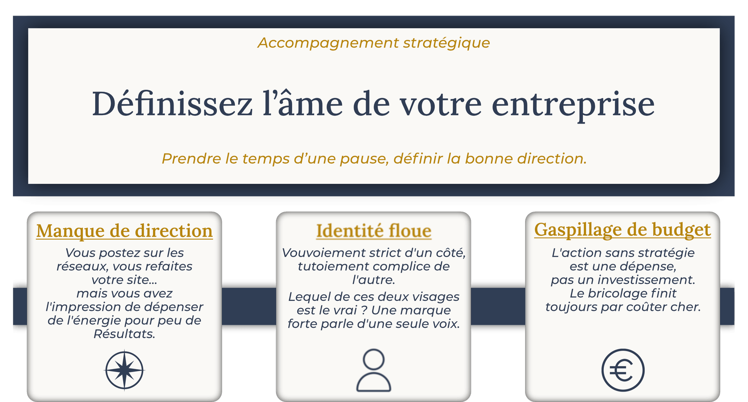 Nous ne vous laissons pas avec des théories fumeuses. Nous construisons ensemble le manuel de pilotage de votre marque.